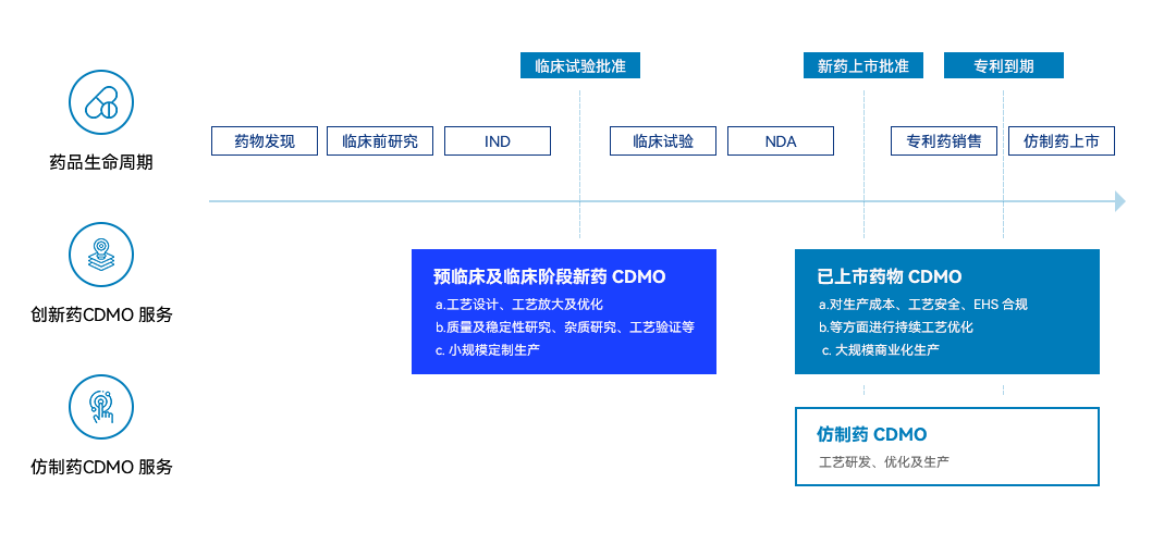 CDMO業務主要指為客戶提供醫藥中間體及原料藥的工藝研發、工藝優化、質量及穩定性研究、定制生產等服務。
